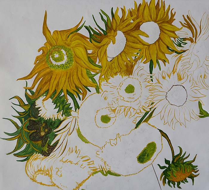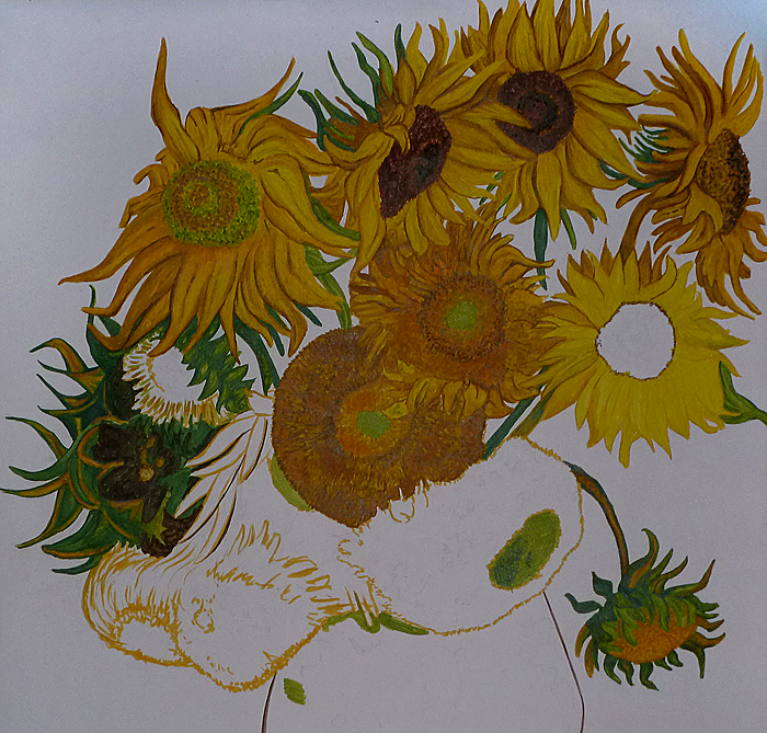 Um die anderen Blumen zu malen, bin ich ähnlich vorgegangen. Wichtig ist auch, dass man die Sonnenblumen nicht mit ein und demselben Gelb malt, sondern mit verschiedenen Tönen interessante Strukturen einbringt, so wie es auch im Original-Gemälde der Fall ist.
